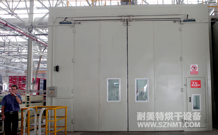 烤漆時,將風門調至烤漆位置,熱風循環,烤房內溫度迅速升高到預定干燥溫度(55℃—60℃)。風機將外部新鮮空氣進行初過濾后,與熱能轉換器發生熱交換后送至烤漆房頂部的氣室,再經過第二次過濾凈化,熱風經過風門的內循環作用,除吸進少量新鮮空氣外,絕大部分熱空氣又被繼續加熱利用,使得烤漆房內溫度逐步升高。當溫度達到設定的溫度時,燃燒器自動停止;當溫度下降到設置溫度時,風機和燃燒器又自動開啟,使烤漆房內溫度保持相對恒定。最后當烤漆時間達到設定的時間時,烤漆房自動關機,烤漆結束。