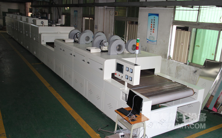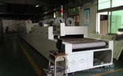 2、外形尺寸(約):總長24500mm*總高1740mm*總寬1890mm,地面到網(wǎng)帶的高度為950-1050mm,爐體內(nèi)進料高度為150mm;烘干部分總長14000mm,分7段獨立控溫(每段4個測溫熱電偶),每段2000mm。冷卻段長4000mm,UV區(qū)2000mm,前后緩沖區(qū)各長500mm,進料部分長2000mm,出料部分長1500mm, 爐體前后大梁上方裝有急停開關,共4個。